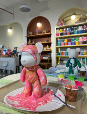 Do jedného kelímka sa zmiešajú rôzne farby a tie sa vylejú na objekt, v našom prípade je to macík/soška.