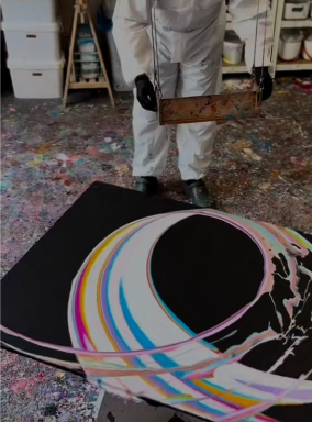 Do špeciálnych maliarskych nádob nalejte akrylové farby a v kombinácii s rotačným stolom a gravitáciou vzniká na plátne vaše umelecké dielo.